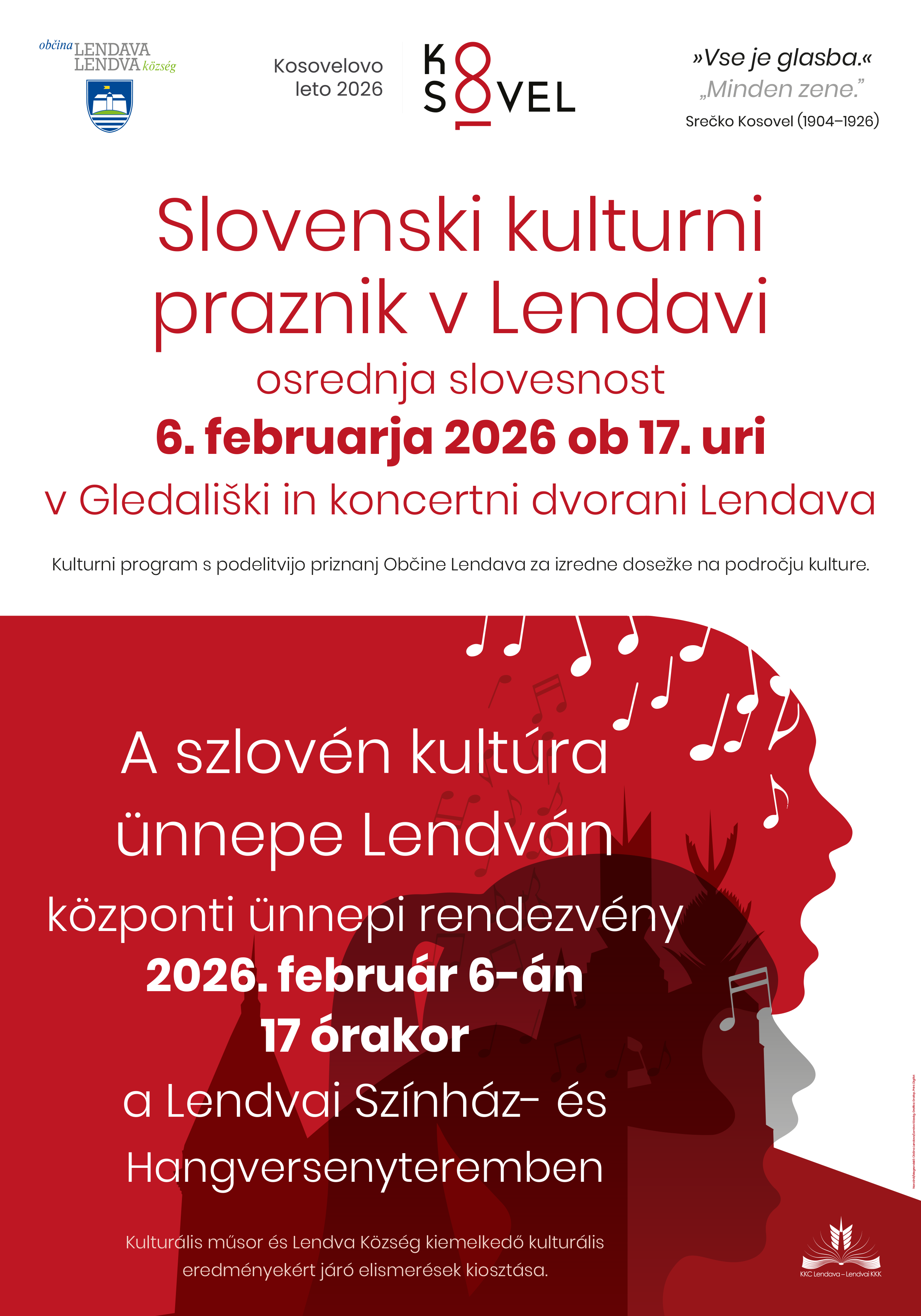 Ob slovenskem kulturnem prazniku vas vljudno vabimo na osrednjo slovesnost, ki bo 6. februarja 2026, ob 17. uri v Gledališki in koncertni dvorani Lendava. Ob tej priložnosti bomo podelili tudi priznanje Občine Lendava za izredne dosežke na področju kulture.