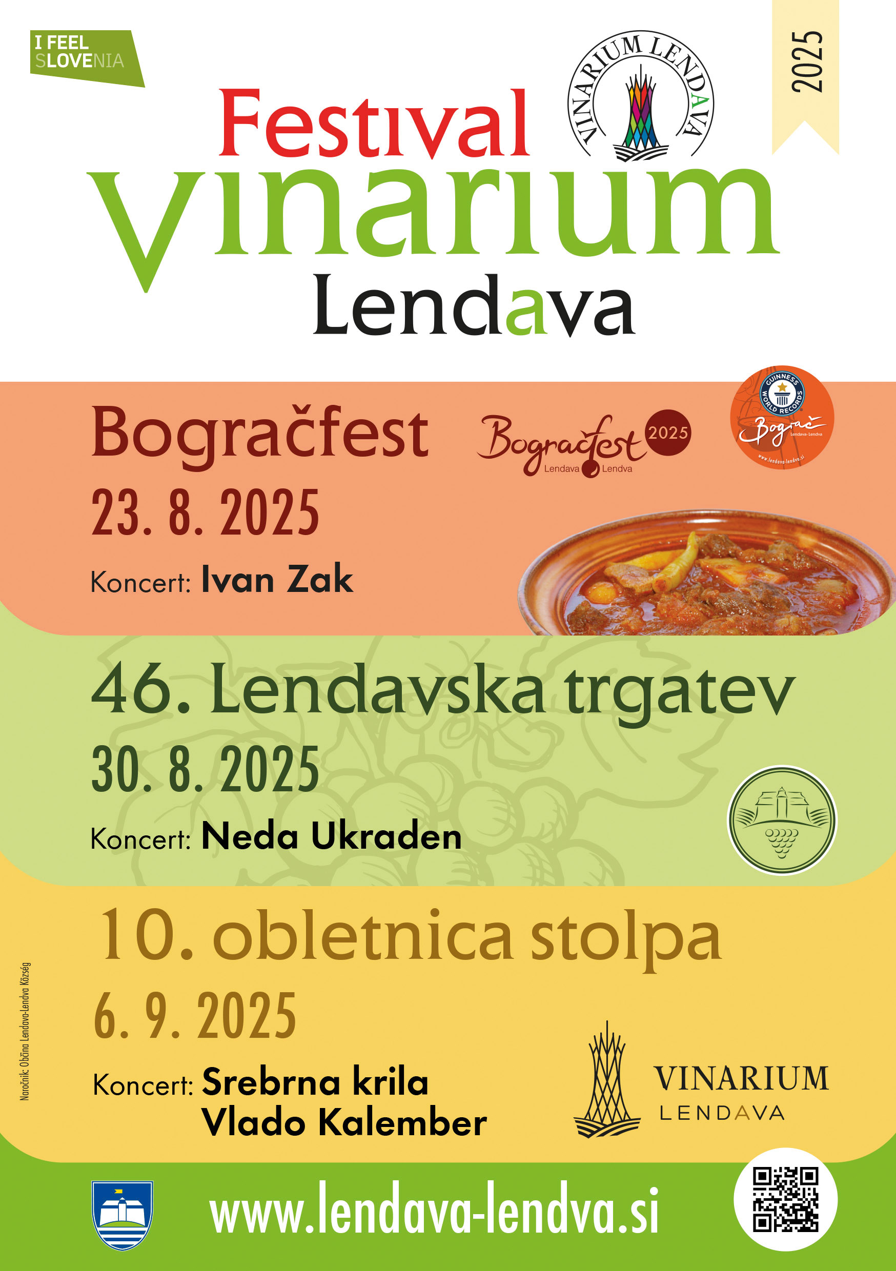 Festival Vinarium obuja poznopoletno dogajanje z dvema osrednjima prireditvama Bogračfestom in Lendavsko trgatvijo ter kulturno-kulinaričnimi dogodki, ki ob koncu avgusta in začetku septembra vabijo na festivalsko doživetje Lendave.