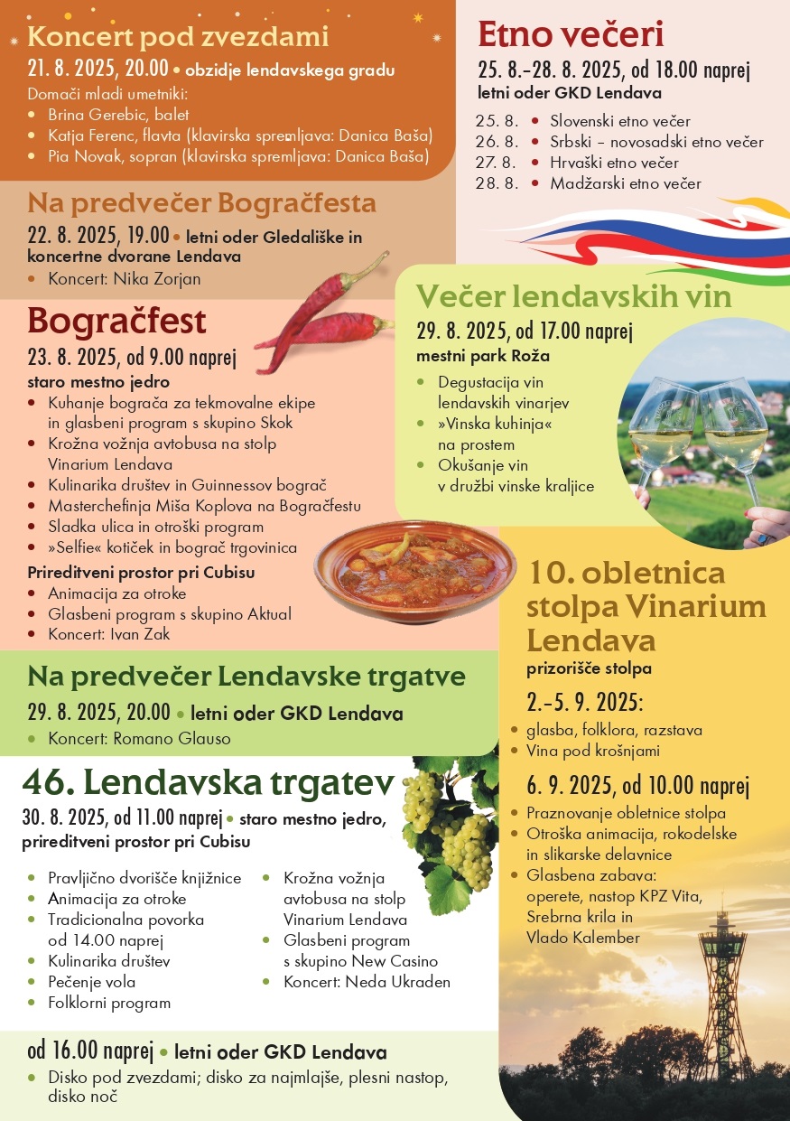 Zadnji dnevi avgusta pričarajo prav posebno vzdušje na letnem odru Gledališke in koncertne dvorane Lendava, kjer e vsak večer posvečen eni narodnosti ali manjšini: slovenski, madžarski, hrvaški in srbski. Prisluhnite ljudskim napevom v novih harmonijah in sodobnih izvedbah, glasbeni dediščini in plesu ter ob tem okusite tudi narodnostno obarvano kulinariko!