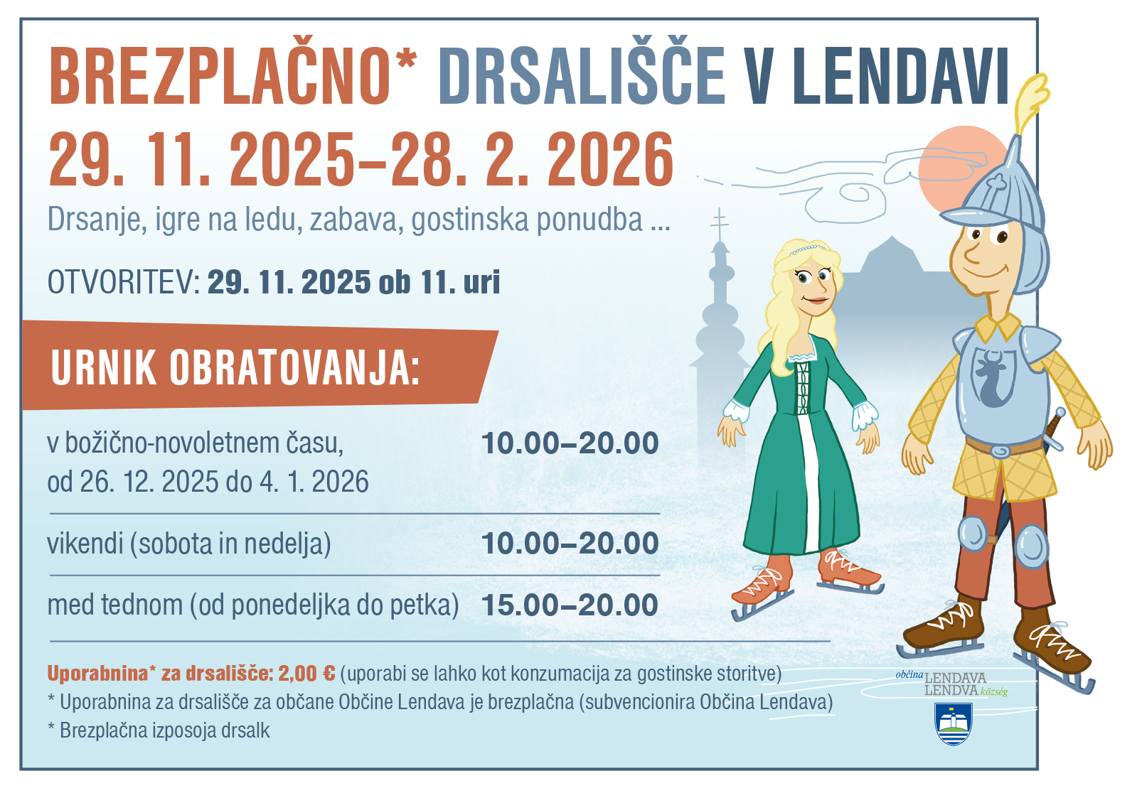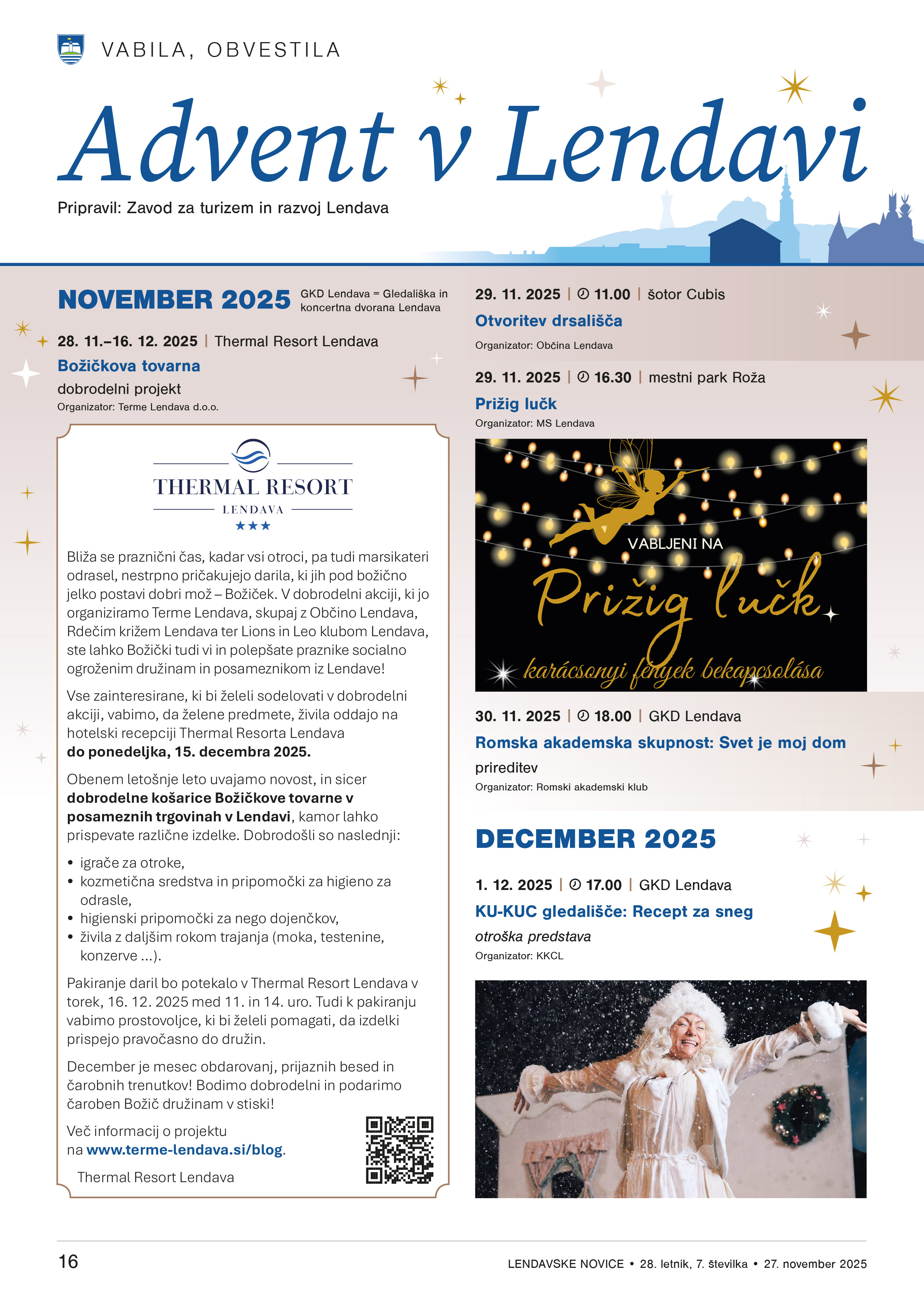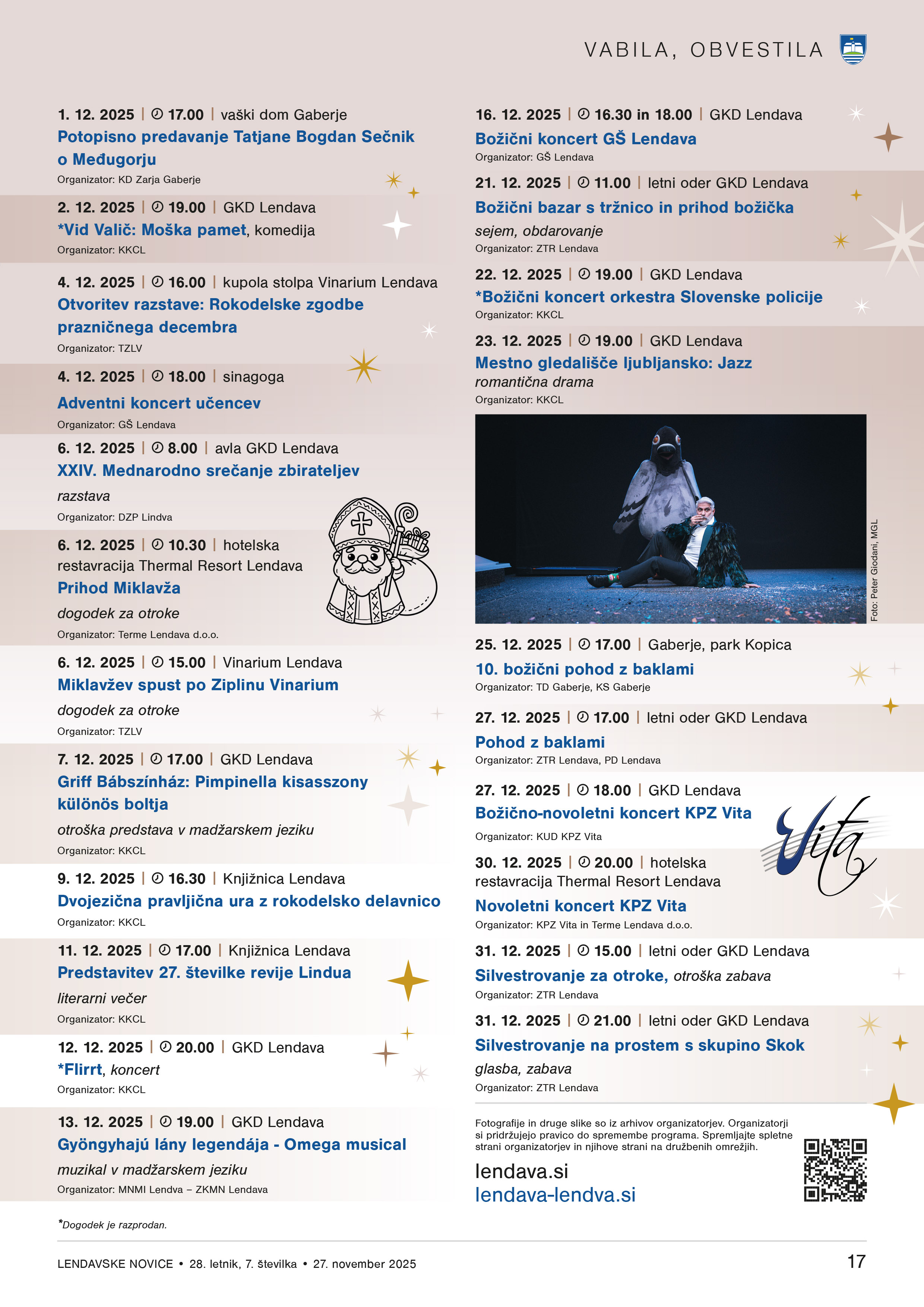Konec leta mrzle zimske dni popestrijo božično-novoletne prireditve, kjer vsak najde nekaj zase. Ob sprehodu skozi praznično okrašeno Lendavo lahko uživate tudi ob pestrem kulturnem programu, okusite kuhano vino in božične dobrote, medtem pa se otroci zabavajo na drsališču in ob prihodu Božička. Najbolj skrivnosten dogodek je vsekakor silvestrski pohod z baklami, kjer se osvetljena »kača« pohodnikov v čarobnem soju bakel počasi vije skozi mesto in zasnežene Lendavske gorice. Zadnji dan leta odštevamo do pričetka novega na silvestrovanju na prostem, vabljeni!